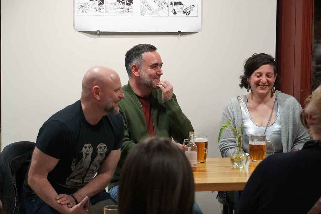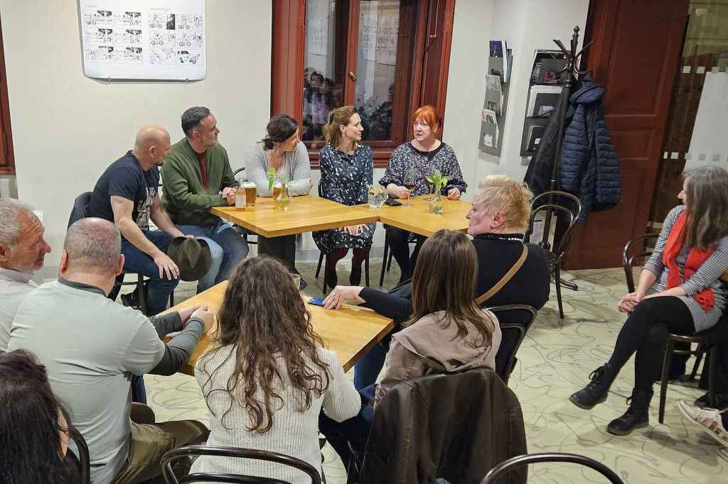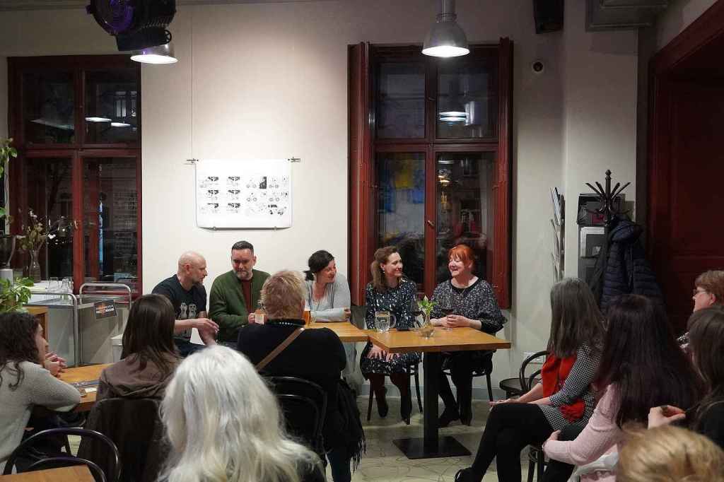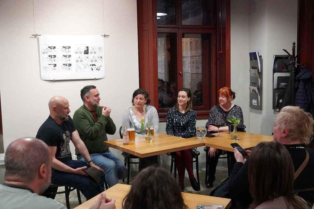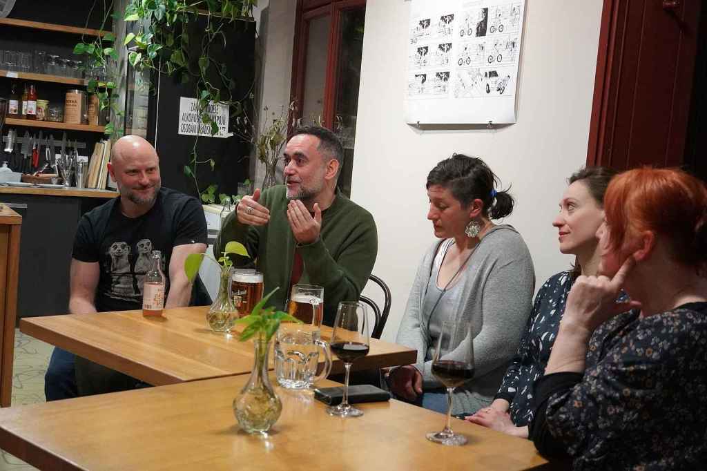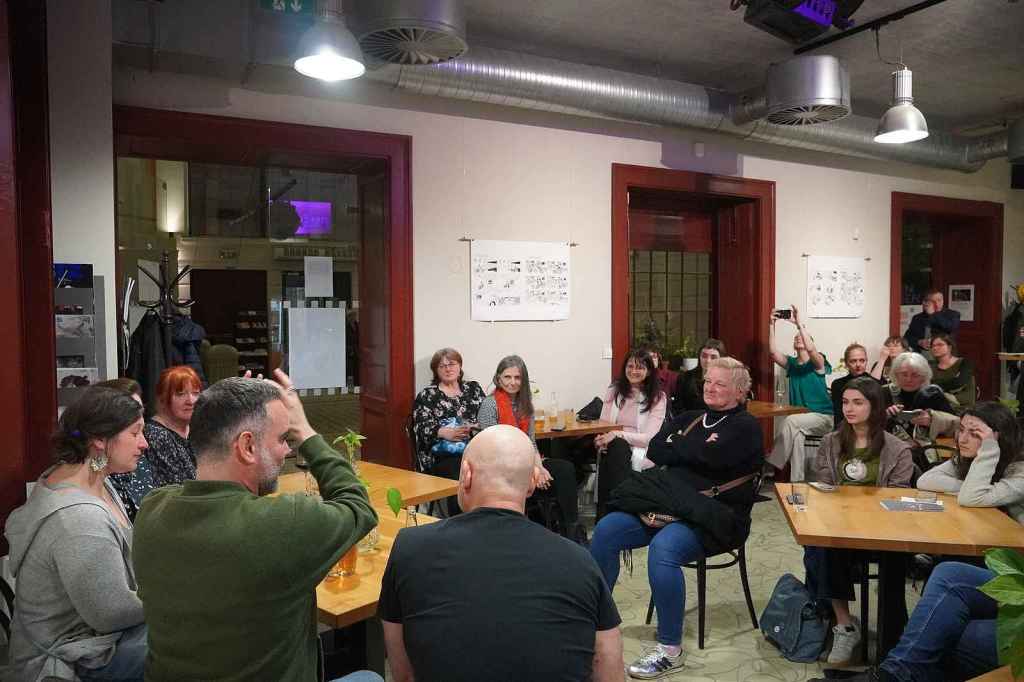 Tras la función, celebramos un encuentro con el público. El encuentro lo moderó Rézi Vydarená, escenógrafa y vestuarista de Clarissa, y mi querido Jan Písařík me ayudó con la traducción simultánea. ¡Llenamos la cafetería del teatro!