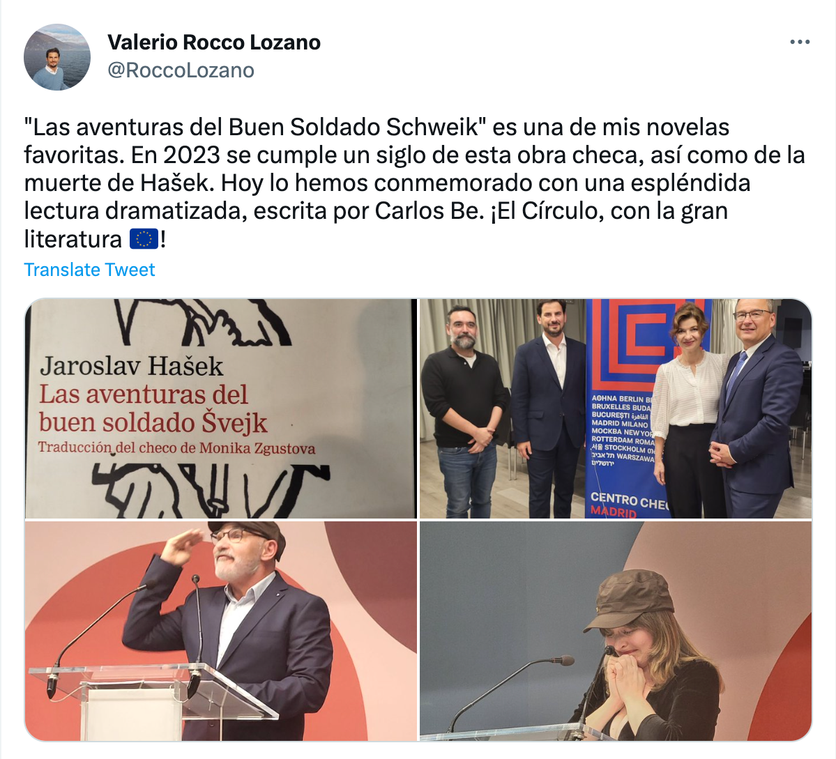El protagonista de la novela El buen soldado Švejk de Jaroslav Hašek, Josef Švejk, es trasladado hasta nuestros días para hablar de temas como la guerra, la paz y nuestra actualidad europea.