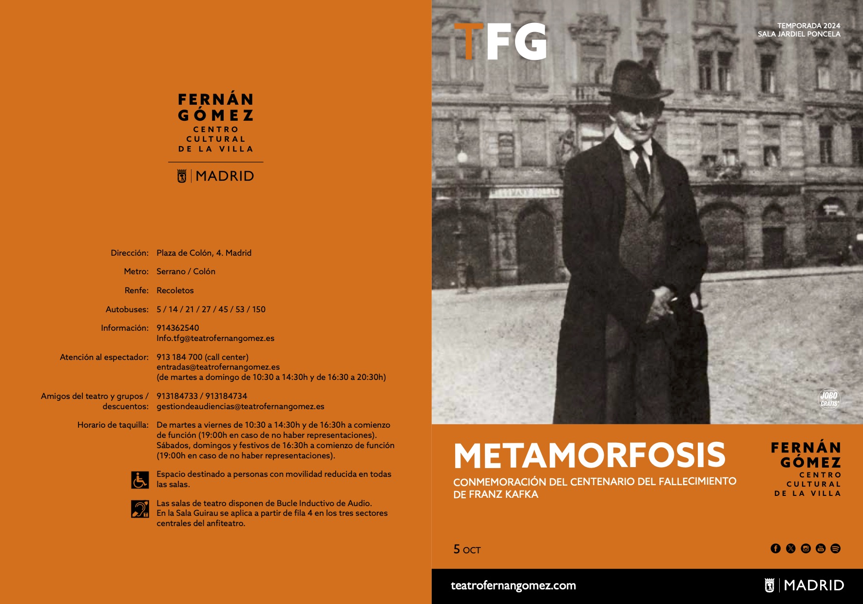 La primera lectura dramatizada de Metamorfosis se celebra en la Sala Jardiel Poncela del Teatro Fernán Gómez de Madrid el sábado 5 de octubre de 2024 con la presencia del Embajador de la República Checa en España Libor Sečka, la directora del Centro Checo de Madrid Jana Polívková y el director artístico del Teatro Fernán Gómez Juan Carlos Pérez de la Fuente.