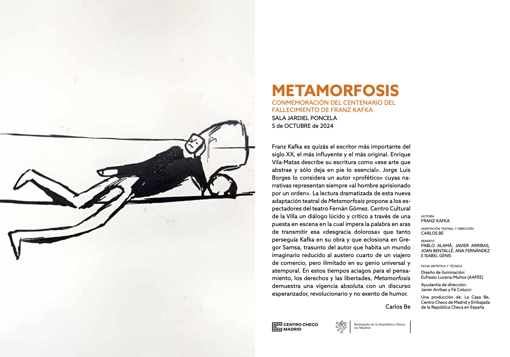 Con motivo del centenario del fallecimiento de Franz Kafka (1883-1924), La Casa Be, el Centro Checo de Madrid y la Embajada de la República Checa en España trasladan hasta nuestros días la obra más popular del autor bohemio en formato de lectura dramatizada.